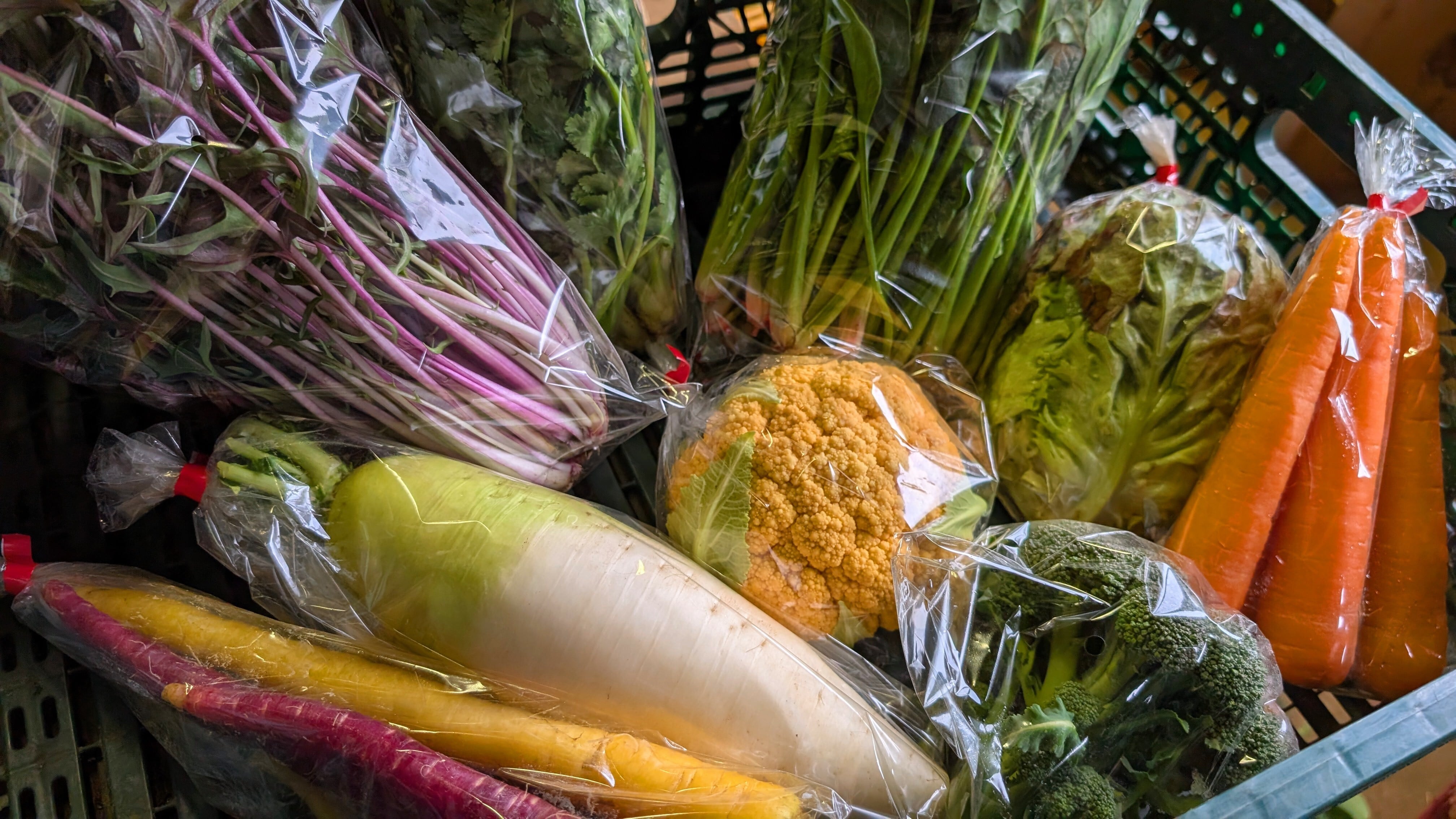 今週の主役は、 寒さで甘みがのった ほうれん草・人参・大根・ブロッコリーなどの冬野菜。